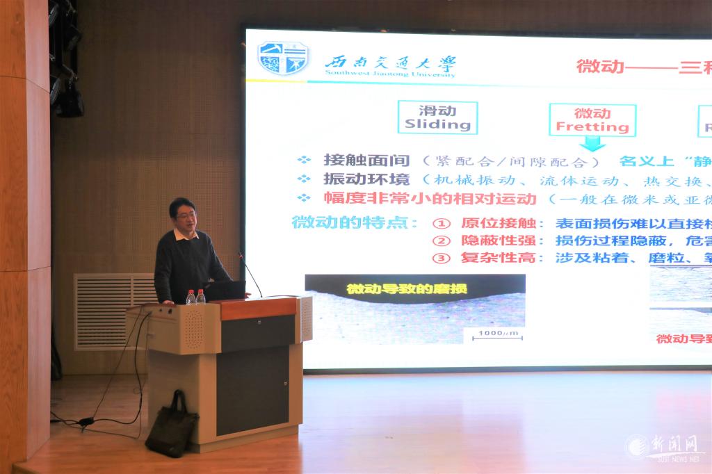 朱旻昊教授以《全模式微動磨損試驗系統(tǒng)研制》為題,首先介紹了微動磨損的特點以及工業(yè)領(lǐng)域中微動磨損失效的典型案例,將微動摩擦學(xué)理論與實驗相結(jié)合,解決了微動磨損中切向、徑向、轉(zhuǎn)動以及扭動多模式集成、位移精準(zhǔn)控制以及損傷過程的原位探測三大難題。隨后朱教授詳細(xì)介紹了微動磨損系統(tǒng)的構(gòu)建方案與實施效果。最后,基于開發(fā)的微動磨損系統(tǒng),就工業(yè)領(lǐng)域中典型磨損失效案例,開展了一系列微動磨損實驗。報告會后,朱教授與現(xiàn)場師生展開了深入討論,并耐心地解答了與會師生提出的問題,使在場師生匪淺。