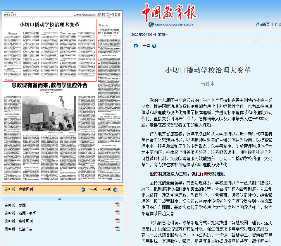 2月3日,《中國教育報》高教周刊版刊發(fā)校長馬建中署名文章《小切口撬動學(xué)校治理大變革》,文章主要闡述了我校作為地方省屬高校,近年來堅持以習(xí)近平新時代中國特色社會主義思想為指導(dǎo),在立德樹人中實(shí)現(xiàn)內(nèi)涵式發(fā)展,構(gòu)建起“機(jī)關(guān)服務(wù)院系、院系服務(wù)師生、師生服務(wù)社會”的良性循環(huán)機(jī)制,實(shí)現(xiàn)以管理服務(wù)效能提升“小切口”撬動學(xué)校治理“大變革”,有力推進(jìn)學(xué)校治理體系和治理能力現(xiàn)代化。全文轉(zhuǎn)載如下: