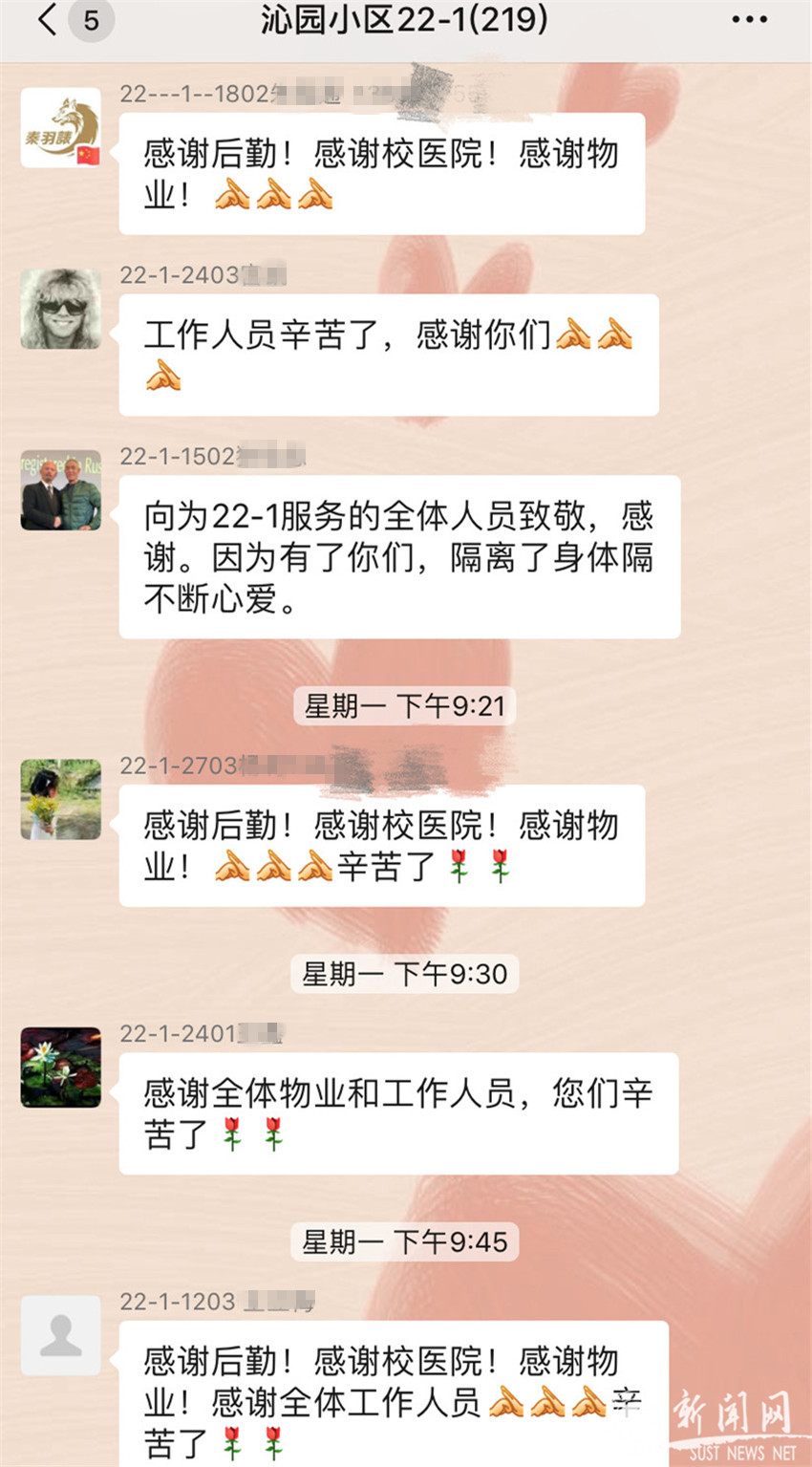 晚上21:20 隔離封閉的第一天順利過去了,大家紛紛在群里表達(dá)著自己的感謝之情,感謝社區(qū)、感謝后勤、感謝物業(yè)、感謝校醫(yī)院……說實話,有些事情我并不清楚具體是學(xué)校哪個部門負(fù)責(zé)的,我也不清楚現(xiàn)在究竟有多少部門、多少工作人員為了我們200多位居民全員出動、滿負(fù)荷運轉(zhuǎn)。但是,我知道學(xué)校守護著我們,我知道這些未曾謀面的工作人員其實比隔離在家的我們接觸的人更多、面臨的風(fēng)險更大、也付出的更多。雖然在這場疫情之前,他們也沒有類似的處理經(jīng)驗,但在這隔離的第一天里,每一件我所關(guān)心的事情都有人比我更關(guān)心,我的每一個需求都得到了及時有效的滿足。