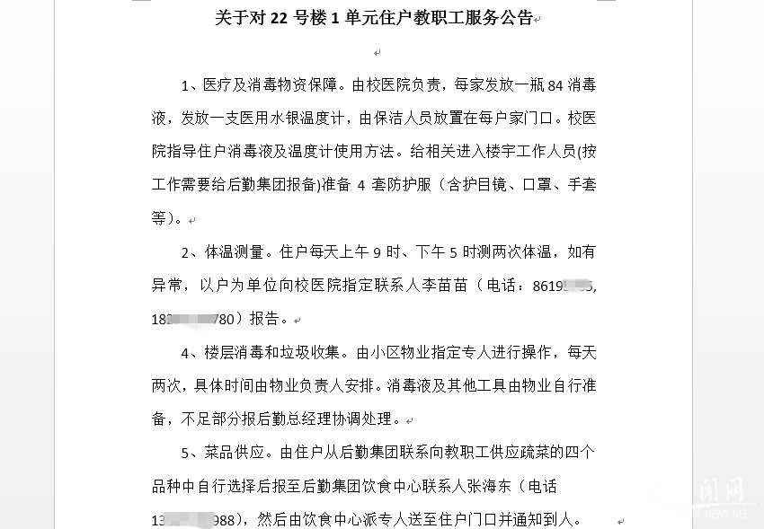 隔離范圍和時限、隔離基本措施在公告中寫得清清楚楚,學(xué)校的公告中還特別提出了對我們隔離區(qū)域的服務(wù)保障,學(xué)校成立了后勤保障組、現(xiàn)場管控組、環(huán)境消毒組等相應(yīng)組織,盡最大努力保障好我們的生活物資、水電氣暖、垃圾清運等生活需求,會每日給我們提供蔬菜等日常生活必需物資,同時對單元及周邊范圍進一步加強消毒,還公布了兩位封閉管理期間聯(lián)系人的手機號碼。說實話,剛看到隔離封閉消息,我內(nèi)心很慌,但公告中的信息打消了我所有的疑慮和顧慮。細(xì)細(xì)想想,就在我睡覺的短短幾個小時內(nèi),這么多事情都有人徹夜未眠替我們考慮周全了。除了不能下樓,我內(nèi)心感覺很踏實、很安全。我邊把公告轉(zhuǎn)發(fā)給爸媽,邊往他們的臥室走,宣布這一系列的消息。