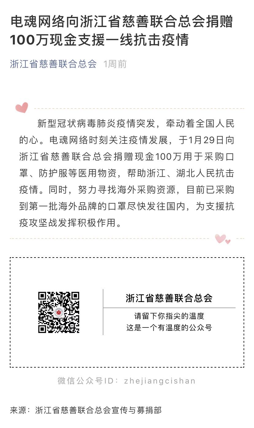 動畫專業(yè)06屆校友郝杰領(lǐng)導(dǎo)著電魂網(wǎng)絡(luò)科技股份有限公司,雖身在杭州卻時刻關(guān)注疫情發(fā)展。1月29日,電魂網(wǎng)絡(luò)向浙江省慈善聯(lián)合總會捐贈現(xiàn)金100萬元,用于采購口罩、防護服等醫(yī)用物資,幫助浙江、湖北人民抗擊疫情。同時,他們還在努力尋找海外采購資源,目前已采購到第一批海外品牌的口罩盡快發(fā)往國內(nèi),為支援抗疫攻堅戰(zhàn)發(fā)揮了積極的作用。