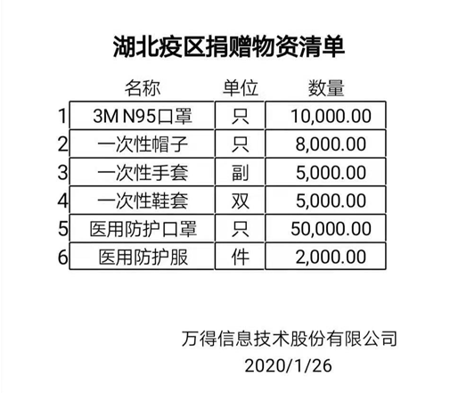 我校上海校友會會長、工業(yè)設(shè)計專業(yè)91屆校友陸風(fēng)是湖北仙桃人,現(xiàn)任上海萬得信息技術(shù)股份有限公司董事長。湖北成為疫情的重災(zāi)區(qū),他心急如焚,立即行動起來。在他的組織下,公司購買了3M口罩、N95口罩、一次性帽子、一次性手套、一次性鞋套、醫(yī)用防護口罩、醫(yī)用防護服等大批急需的防疫物資捐贈給家鄉(xiāng)。他表示,這樣做,既是想表達自己對家鄉(xiāng)人民的鼎力支持,也是彰顯上海萬得在疫情面前萬眾一心、眾志成城的大愛情懷。