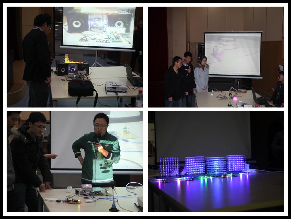 決賽當晚亮點不斷,創(chuàng)意無限。8支入圍團隊依次上臺進行作品展示和公開答辯。《基于ARM的雙通道立體聲人機交互式音樂播放器》利用“互聯(lián)網(wǎng)+”技術控制3維立體圖案和音樂的播放,充分活躍了現(xiàn)場的氣氛;《PWM配光燈》為一款家用調(diào)色配光燈,以新穎的顏色帶給大家浪漫的享受;《光學測距儀》利用超聲波定距追蹤小車,速度與功能的完美融和讓人贊不絕口;《聯(lián)動心房》獨特的造型設計和酷炫的LED效果讓全場人員心跳加速;《3D服裝屋》各色的精美服裝只為您量身定做;《基于LabVIEW的智能導向停車場》便捷停車一步到位;《3D照相館》通過全新體驗的打印技術,獲得立體的3D模型;《基于單片機的音樂噴泉》帶你走進真實的單片機世界。