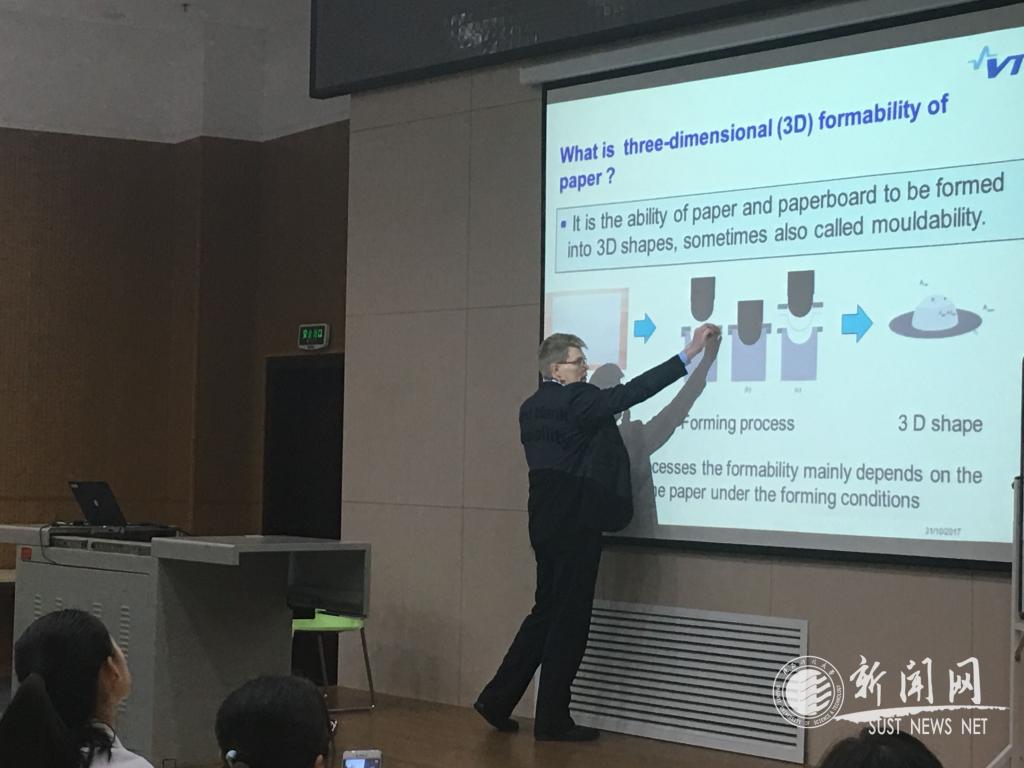 Elias教授做了制漿造紙相關領域的系列專題報告“Three-dimensional formability of paper”和“Tool for evaluation of the quality of recycled fiber material”。系統(tǒng)講述了國外造紙企業(yè)、研究院等在纖維素包裝材料制品領域的研究探索,重點介紹了在包裝材料制作工藝、技術層面的創(chuàng)新實例,及在補充石油基包裝材料缺陷方面的優(yōu)勢,為纖維包裝材料的應用提供理論依據。報告中清晰的研究思路、創(chuàng)新的實驗設想和嚴謹的數據分析,對啟發(fā)和提高我院師生的科研思路和水平很有幫助,拓寬了學生的知識與眼界,師生們積極地參與了后續(xù)的答疑解惑環(huán)節(jié),Elias教授認真聽取了各種問題并且悉心做出解答。