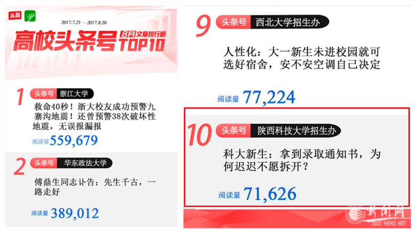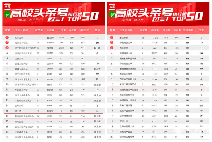 在教育部頭條號(hào)微言教育聯(lián)合“今日頭條”官方評(píng)選的榜單中,“陜西科技大學(xué)招生辦”頭條號(hào),8月位列全國高校同類頭條號(hào)排名第一名,7月位列全國第三名;在全國高校優(yōu)質(zhì)頭條號(hào)7月榜單TOP50中位列第16名,8月榜單TOP50中位列第11名。