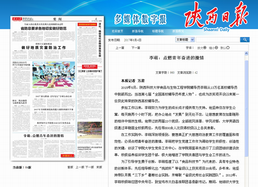 陜西日報6月4日4版“要聞”以《李萌:點燃青年奮進的激情》為題,報道我校優(yōu)秀輔導員李萌入選3月“中國好人榜”“敬業(yè)奉獻好人”的先進事跡。“中國好人榜”評議活動由中央文明辦主辦、中國文明網(wǎng)承辦。此前,李萌被評為陜西省2015年11-12月“陜西好人榜”“敬業(yè)奉獻類”“陜西好人”。