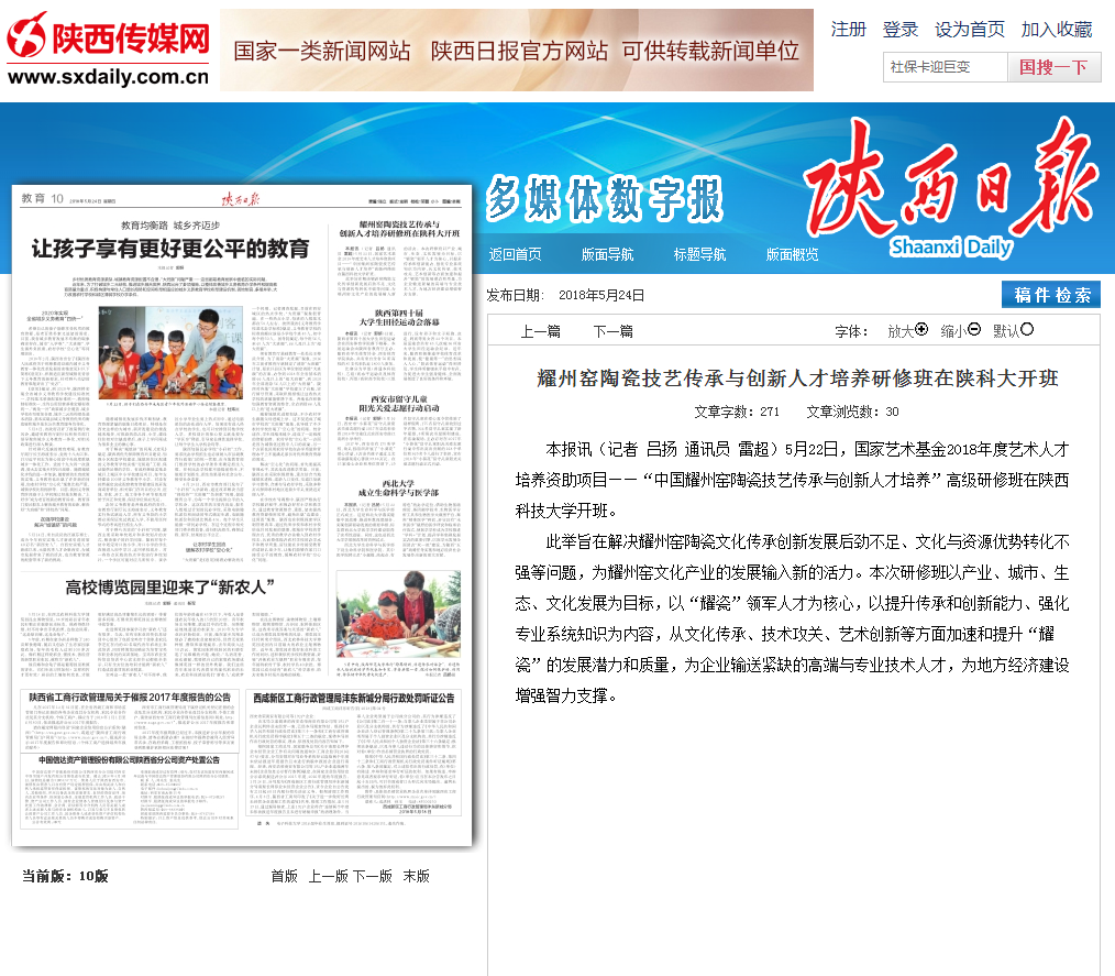 5月24日,《陜西日報》教育版報道了我校舉辦耀州窯陶瓷技藝傳承與創(chuàng)新人才培養(yǎng)研修班活動的新聞,全文轉載如下: