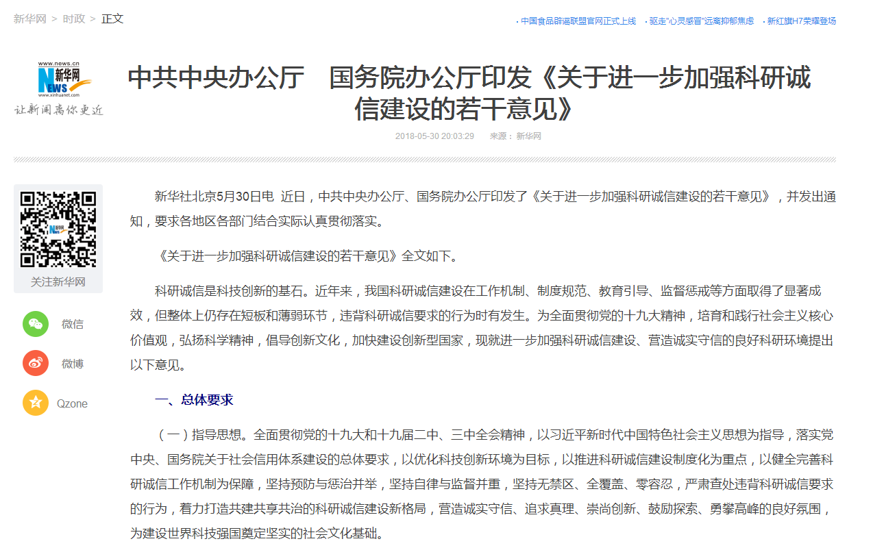 近日,中共中央辦公廳、國務院辦公廳印發(fā)了《關(guān)于進一步加強科研誠信建設的若干意見》,并發(fā)出通知,要求各地區(qū)各部門結(jié)合實際認真貫徹落實。全文轉(zhuǎn)載如下: