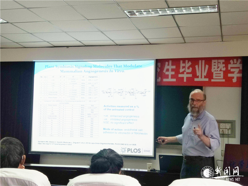 6月8日,澳大利亞國立大學(xué)資深有機(jī)及生物質(zhì)譜學(xué)專家Charles Hocart作了題為“Soybean Secondary Metabolites that Modulate Angiogenesis”的學(xué)術(shù)報告。報告會由化工學(xué)院院長馬養(yǎng)民教授主持。Charles Hocart教授長期從事天然產(chǎn)物有效活性成分提取及植物細(xì)胞生物學(xué)方面的基礎(chǔ)研究,他詳細(xì)講解了自己及團(tuán)隊在調(diào)節(jié)血管生成的大豆次級代謝產(chǎn)物方面相關(guān)的研究成果。他們從大豆的木質(zhì)部汁液中成功提取了調(diào)節(jié)血管生成的有效活性化合物,通過質(zhì)譜和核磁共振等實(shí)驗(yàn)手段進(jìn)行結(jié)構(gòu)鑒定,并利用內(nèi)皮細(xì)胞愈合實(shí)驗(yàn)進(jìn)一步研究了這些活性化合物調(diào)節(jié)血管生成的作用機(jī)理。