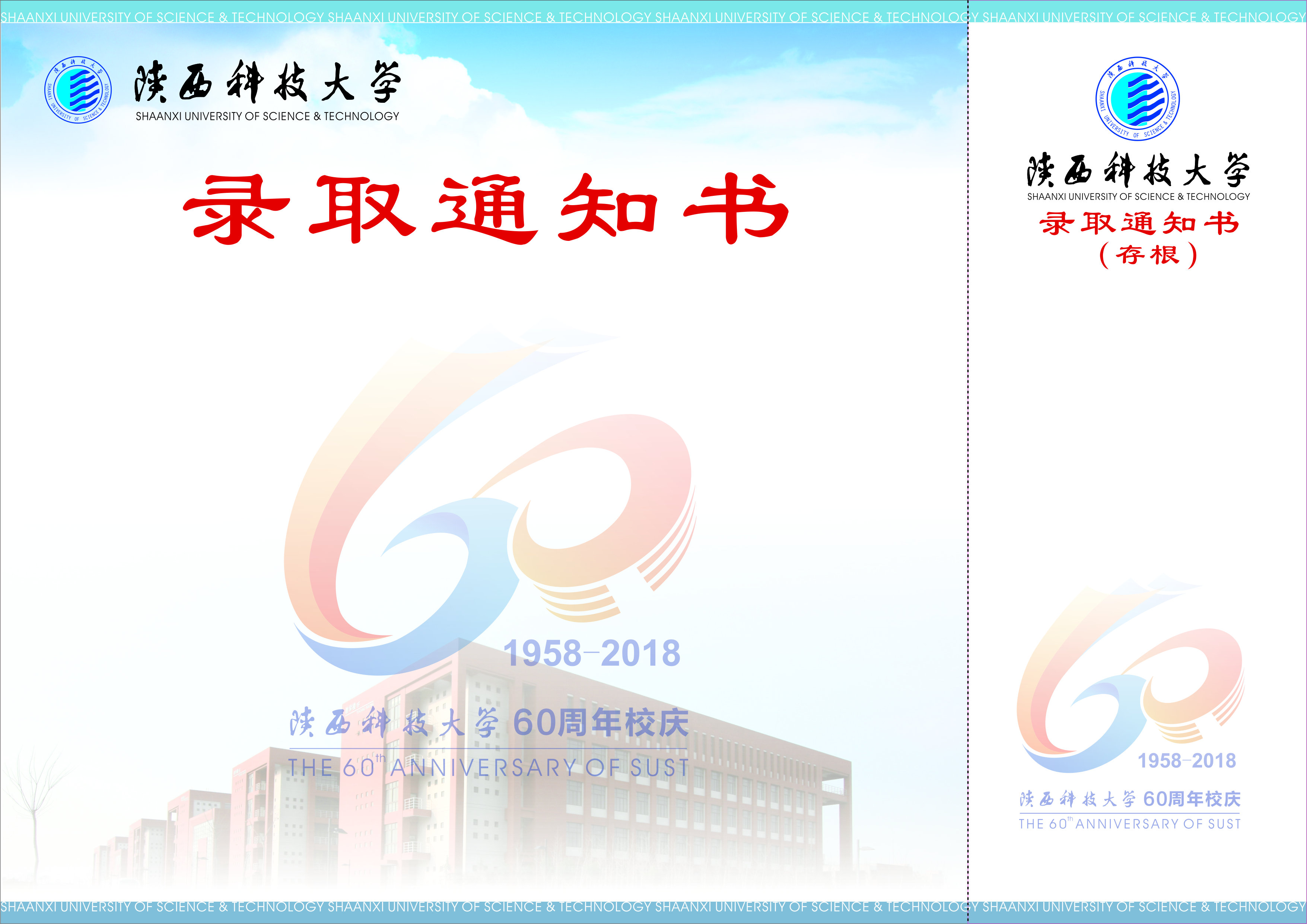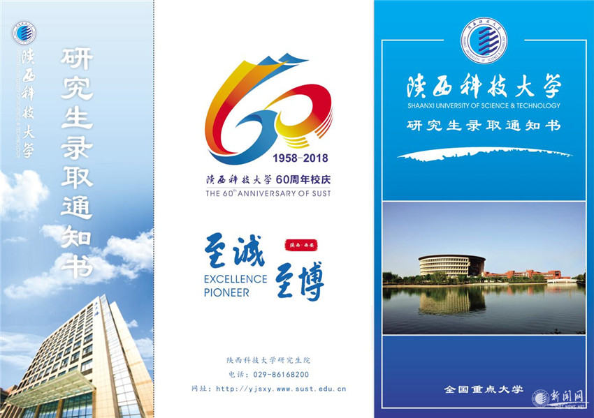 “校慶版”錄取通知書主色調(diào)為校徽藍,色彩清新明快,封面右側(cè)是?;蘸臀倚5貥诵越ㄖD書館湖景圖,封面左側(cè)是校慶徽標和校訓,其中突出顯示的60周年校慶徽標與內(nèi)頁水印相呼應(yīng),展現(xiàn)出母校六十年的奮斗與輝煌和學子們?nèi)膼坌V?,贏得了師生們的贊揚與喜愛。材料學院擬錄取研究生小李說“我會好好的珍藏錄取通知書,被學校錄取的自豪與即將到來的60周年校慶對我來說是難忘的美好記憶”。設(shè)藝學院小盧說“很榮幸在學校60周年校慶之際成為陜科大研究生的一份子,希望能與學校一起成長”。