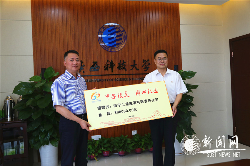 6月25日下午,海寧上元皮革有限責(zé)任公司、淄博大桓九寶恩皮革集團(tuán)有限公司捐贈儀式在逸夫樓416會議室舉行。浙江大眾皮業(yè)有限公司董事長、海寧上元皮革有限責(zé)任公司董事長、我校皮90級校友許建新、淄博大桓九寶恩皮革集團(tuán)有限公司董事長、我校皮87級校友周國祥,我校皮87級校友于明東,校長馬建中,校友總會顧問董繼先,中國輕工業(yè)博物館館長王宏,輕工學(xué)院黨委書記、副院長李新平出席捐贈儀式。陜西科技大學(xué)副校長王學(xué)川主持儀式。