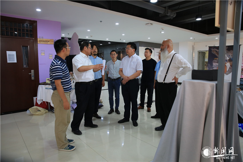 王宏兵一行在校紀(jì)委書(shū)記、設(shè)計(jì)學(xué)學(xué)術(shù)帶頭人王樹(shù)茂教授的陪同下,參觀了設(shè)藝學(xué)院畢業(yè)設(shè)計(jì)展,并同產(chǎn)品設(shè)計(jì)、工業(yè)設(shè)計(jì)、視覺(jué)傳達(dá)設(shè)計(jì)、動(dòng)畫(huà)、環(huán)境藝術(shù)等教研室主任和策展負(fù)責(zé)人老師進(jìn)行了深入交流。王宏兵指出,咸陽(yáng)市和陜西科技大學(xué)設(shè)計(jì)與藝術(shù)學(xué)院在文化創(chuàng)意產(chǎn)品、旅游紀(jì)念品、傳統(tǒng)文化的視覺(jué)化展示、景區(qū)內(nèi)容建設(shè)、媒體內(nèi)容建設(shè)等方面具有很大的合作空間,市文廣新局、市旅游局等相關(guān)部門(mén)要盡快就具體合作事宜進(jìn)行對(duì)接。