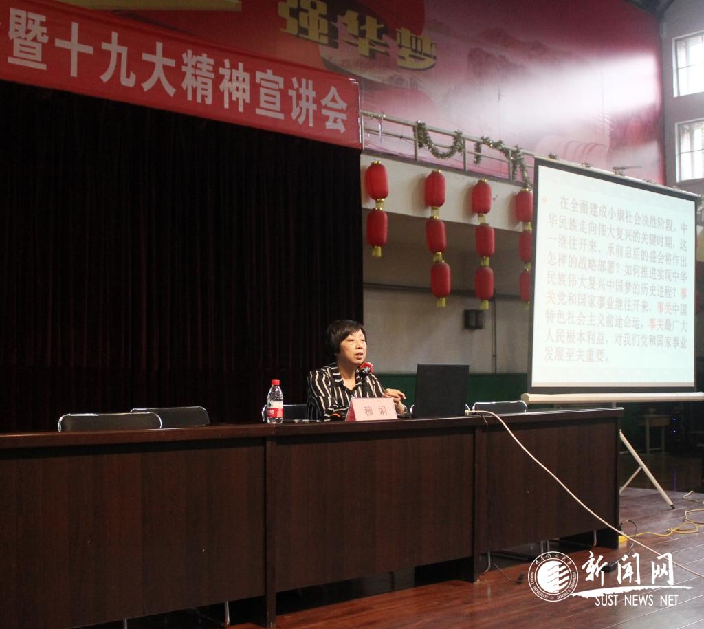 在表彰儀式后,咸陽市黨的十九大精神專家宣講團成員,陜西省黨校系統(tǒng)優(yōu)秀教師,中共咸陽市委黨校黨史黨建教研室主任穆娟教授為全體黨員干部教師作了題為“面向新時代的政治宣言和行動綱領(lǐng)——學(xué)習(xí)領(lǐng)會黨的十九大精神”的專題宣講報告。穆娟教授緊扣黨的十九大報告,從充分認(rèn)識黨的十九大的重大意義、全面準(zhǔn)確學(xué)習(xí)領(lǐng)會黨的十九大精神、以高度政治自覺貫徹落實好十九大精神三個大的方面對黨的十九大精神進行了的解讀。