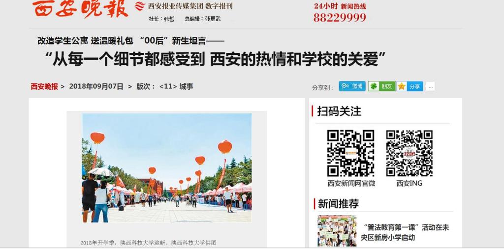 《西安晚報(bào)》9月7日以《改造學(xué)生公寓 送溫暖禮包 “00后”新生坦言——“從每一個(gè)細(xì)節(jié)都感受到 西安的熱情和學(xué)校的關(guān)愛(ài)”》為題,報(bào)道我校通過(guò)改造學(xué)生公寓、準(zhǔn)備“迎新送溫暖禮包”等這些溫暖的方式緩解新生“鄉(xiāng)愁”,鼓勵(lì)學(xué)生學(xué)會(huì)獨(dú)立,盡快適應(yīng)大學(xué)生活。