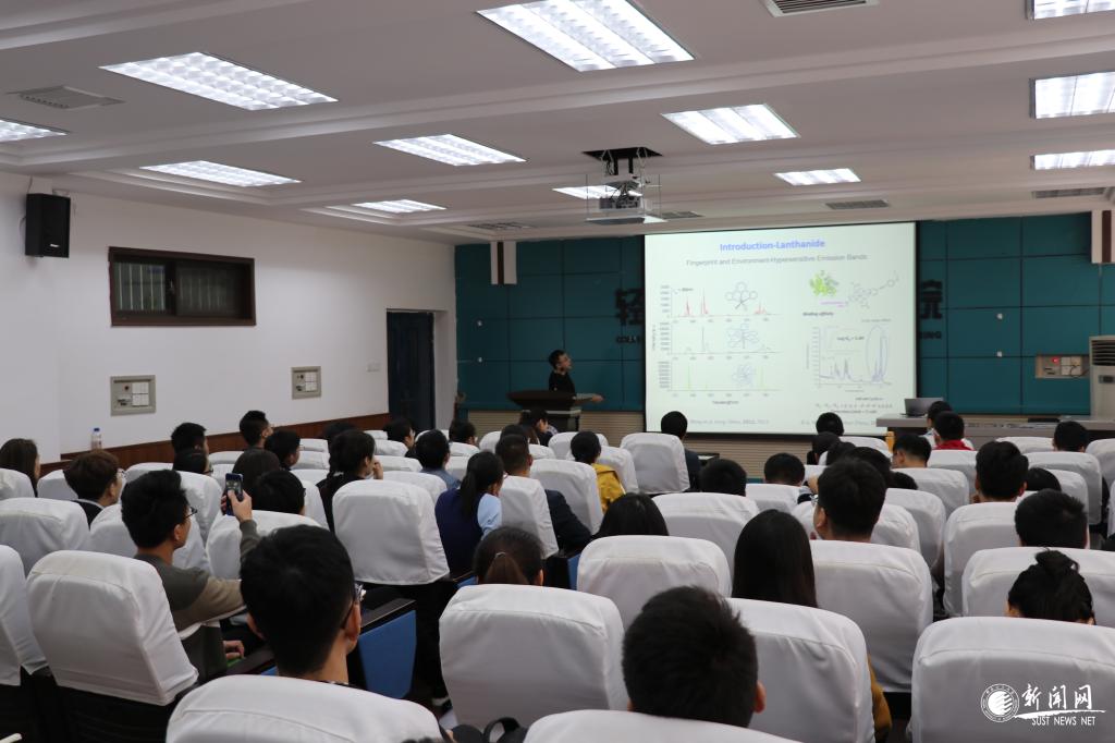 黃嘉良教授報(bào)告的題目是“鑭系配合物在腫瘤影像學(xué)及腫瘤抑制中的應(yīng)用”。順鉑(鉑金屬配合物)作為一種經(jīng)典的抗癌藥物,難以選擇性地對(duì)腫瘤進(jìn)行抑制,其毒性也會(huì)對(duì)正常的身體組織造成傷害,由此帶來極大的副作用,往往被人詬病。黃嘉良教授團(tuán)隊(duì)利用釕配合物更小的毒性以及更高的可操作性,提出以釕代替鉑設(shè)計(jì)低副作用抗癌藥物的理念,并通過前體藥物的組裝,進(jìn)一步提高了這種新型抗癌藥物的可控性與安全性。與此同時(shí),銪作為鑭系元素的一員,具有高辨識(shí)度的可見光發(fā)射峰,該配合物被認(rèn)為是一種極具潛力的光信號(hào)產(chǎn)生器。將銪與釕的兩種配合物進(jìn)行組合,可控的藥物釋放與即時(shí)的定位檢測(cè)在特定化合物中成為了現(xiàn)實(shí),充分地迎合了藥物開發(fā)中對(duì)于復(fù)合功能性的要求。黃嘉良教授的報(bào)告使現(xiàn)場(chǎng)師生對(duì)鑭系配合物的功能和在腫瘤抑制中的應(yīng)用有了很好的了解,開闊了大家的眼界,對(duì)今后研究方向的拓展有很好的啟發(fā)性。報(bào)告最后,黃嘉良教授就大家的提問進(jìn)行了耐心詳盡的解答。