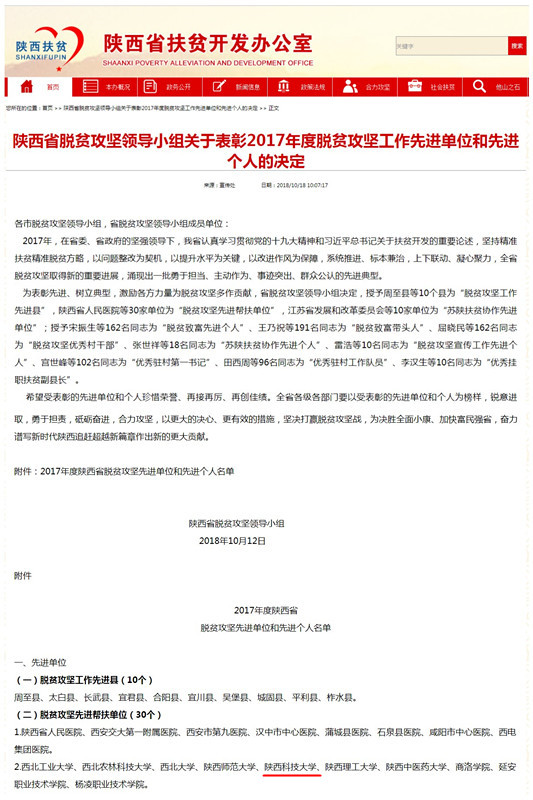 近日, 陜西省脫貧攻堅(jiān)領(lǐng)導(dǎo)小組在官網(wǎng)公布了《關(guān)于表彰2017年度脫貧攻堅(jiān)工作先進(jìn)單位和先進(jìn)個(gè)人的決定》,我校榮獲全省脫貧攻堅(jiān)先進(jìn)幫扶單位榮譽(yù)稱號(hào)。