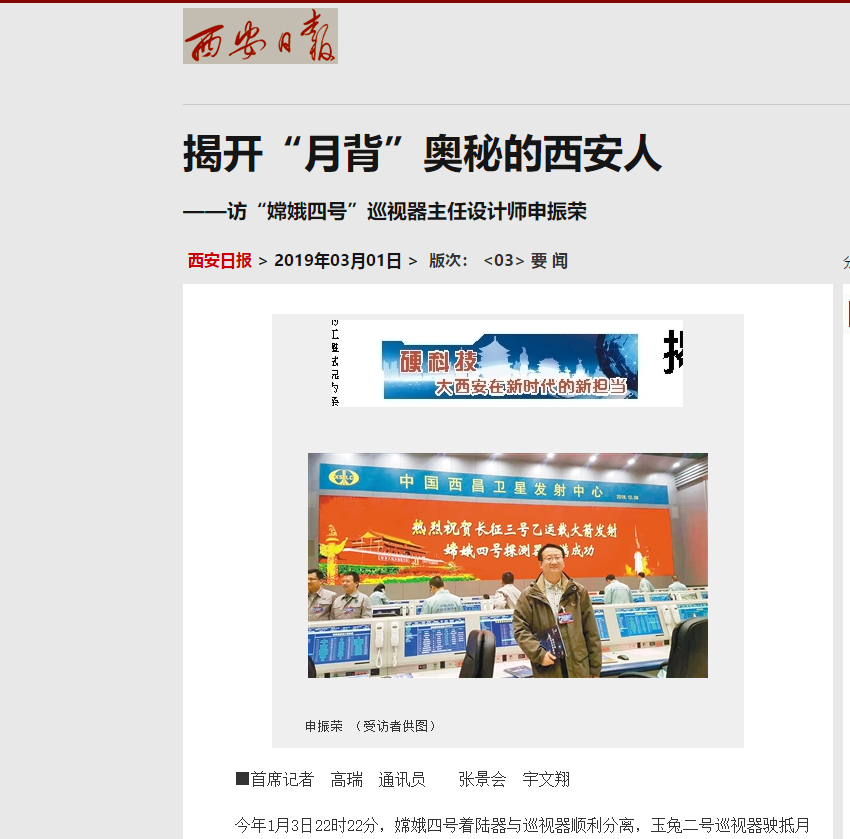 3月1日,《西安日報》刊發(fā)文章,報道了我校機制90級校友、嫦娥四號巡視器主任設(shè)計師申振榮揭開“月背”奧秘的事跡。全文轉(zhuǎn)載如下: