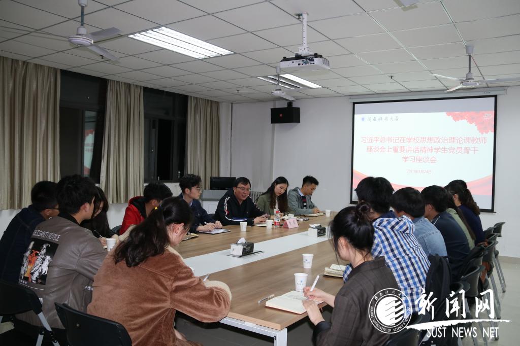 3月24日晚,我校在教四C-503舉行學(xué)生黨員骨干學(xué)習(xí)座談會,深入學(xué)習(xí)習(xí)近平總書記在學(xué)校思想政治理論課教師座談會上重要講話精神。各學(xué)院學(xué)生黨員代表,研究生會、學(xué)生會主要干部20余人參加會議,會議由赴京參會的我校學(xué)工部副部長李萌主持。