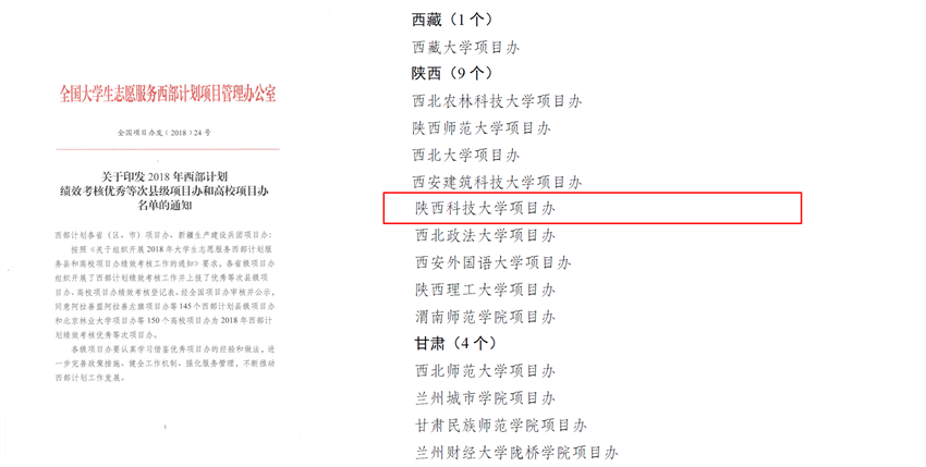 近日,全國大學(xué)生志愿服務(wù)西部計劃項目辦下發(fā)《關(guān)于印發(fā)2018年西部計劃績效考核優(yōu)秀等次縣級項目辦和高校項目辦名單的通知》,我校榮獲2018年全國大學(xué)生志愿服務(wù)西部計劃績效考核“優(yōu)秀項目辦”稱號。