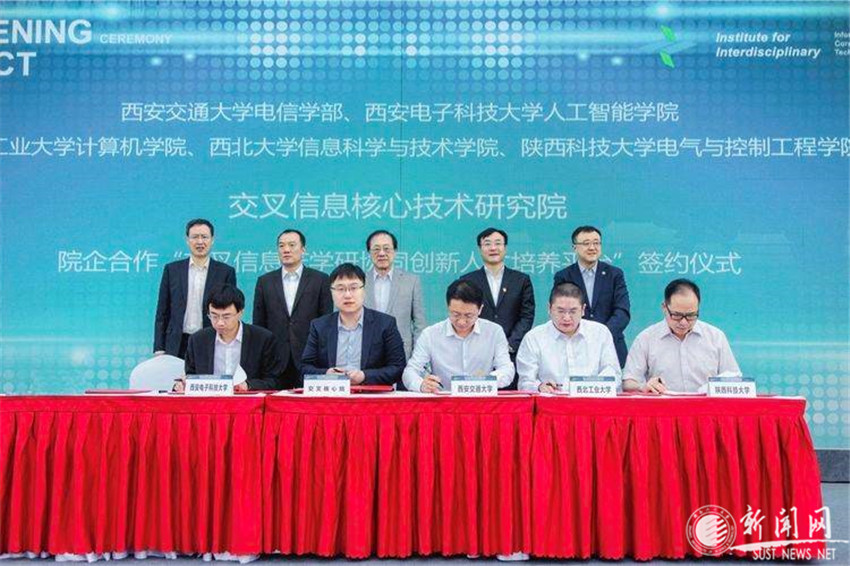 投運(yùn)慶典儀式上,在姚期智、鐘洪江、王勇、楊斌、李志軍的共同見證下,交叉核心院與陜西科技大學(xué)電氣與控制工程學(xué)院、西安交通大學(xué)電信學(xué)部、西安電子科技大學(xué)人工智能學(xué)院、西北工業(yè)大學(xué)計(jì)算機(jī)學(xué)院、西北大學(xué)信息科學(xué)與技術(shù)學(xué)院等5所培養(yǎng)單位以及中國(guó)銀行業(yè)協(xié)會(huì)、德邦證券股份有限公司、西安深信科創(chuàng)信息技術(shù)有限公司、新石器交叉信息核心技術(shù)研究院(西安)等4家企業(yè)簽約,合作建立“交叉信息產(chǎn)學(xué)研協(xié)同創(chuàng)新人才培養(yǎng)平臺(tái)”。湯偉代表我校電控學(xué)院上臺(tái)簽約并領(lǐng)牌。