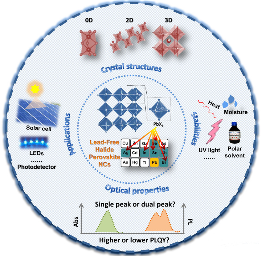 2014年,鹵化物鈣鈦礦納米晶的首次發(fā)現(xiàn)吸引了全球的目光。然而,傳統(tǒng)鹵化物鈣鈦礦納米晶往往含有毒性元素鉛,從而限制其進(jìn)一步商業(yè)化應(yīng)用。在這種形勢(shì)下,既能避免毒性金屬元素使用,又能保留鈣鈦礦優(yōu)異特性的無鉛鹵化物鈣鈦礦納米晶應(yīng)運(yùn)而生。然而,圍繞無鉛鹵化物鈣鈦礦納米晶的相關(guān)研究報(bào)道數(shù)據(jù)缺乏系統(tǒng)性和深入性,導(dǎo)致現(xiàn)階段該類材料研究進(jìn)展較緩?;诖?,馬建中教授團(tuán)隊(duì)對(duì)現(xiàn)階段無鉛鹵化物鈣鈦礦納米晶的系列報(bào)道進(jìn)行了系統(tǒng)而深入的研讀,并結(jié)合團(tuán)隊(duì)相關(guān)研究基礎(chǔ),在該論文中就無鉛鹵化物鈣鈦礦納米晶的晶體結(jié)構(gòu)、穩(wěn)定性、光學(xué)性能、制備方法及最新應(yīng)用等進(jìn)行了全面介紹;針對(duì)“飽受爭(zhēng)議”的穩(wěn)定性及光學(xué)性能問題,首次系統(tǒng)分析了無鉛鹵化物鈣鈦礦納米晶穩(wěn)定性及光學(xué)性能的影響機(jī)制,并就如何提高其穩(wěn)定性及光學(xué)性能進(jìn)行了深入探討。該論文的發(fā)表有望對(duì)該類材料的后續(xù)深入研究和開發(fā)提供較強(qiáng)的理論指導(dǎo)和借鑒意義。