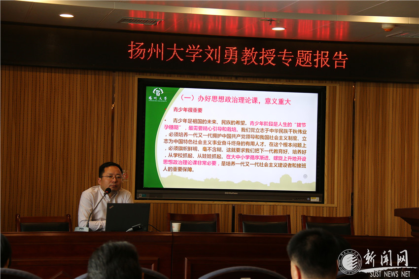 為進(jìn)一步貫徹落實(shí)習(xí)近平總書記在學(xué)校思想政治理論課教師座談會上的重要講話精神,推動教學(xué)活動月的有效開展,6月12日上午,揚(yáng)州大學(xué)馬克思主義學(xué)院劉勇教授應(yīng)邀來我校馬克思主義學(xué)院,在人文樓1013學(xué)術(shù)報告廳為廣大師生作了題為《爭做思想政治理論的“播火者”——學(xué)習(xí)習(xí)近平“3.18”重要講話的幾點(diǎn)體會》的專題報告。本次報告由馬院副院長郗芙蓉主持,馬院全體師生參加了此次報告會。
