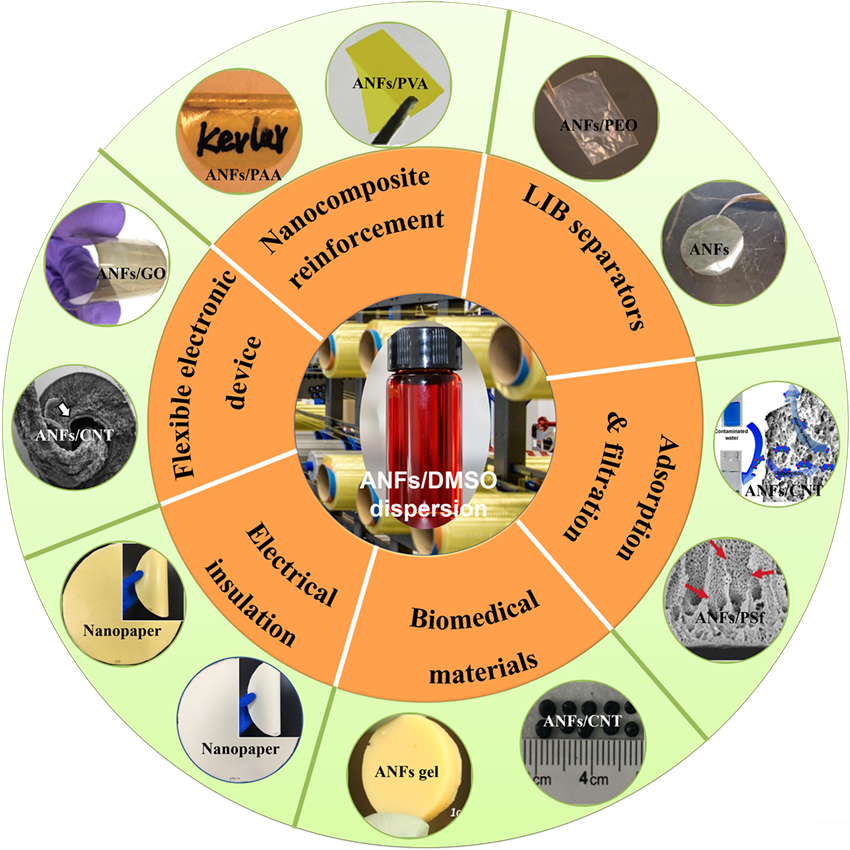 芳綸納米纖維(aramid nanofibers, ANFs)作為近年來開發(fā)的一種新型納米高分子材料,兼具對(duì)位芳綸纖維和高分子納米纖維的雙重優(yōu)勢(shì),可有效解決芳綸纖維存在的表面光滑惰性強(qiáng)、復(fù)合界面強(qiáng)度弱等問題。同時(shí),ANFs可與聚合物基體通過物理/化學(xué)/自組裝交聯(lián)作用高效復(fù)合,使其成為構(gòu)建高性能復(fù)合材料極具潛力的“增強(qiáng)構(gòu)筑單元”,在納米復(fù)合材料領(lǐng)域起著重要的界面增強(qiáng)與材料增韌作用,在電氣絕緣、電池隔膜、吸附過濾、柔性電極等領(lǐng)域應(yīng)用前景廣闊。然而,ANFs自2011年被報(bào)道以來,ANFs制備周期長(zhǎng)(7天)、反應(yīng)濃度低(0.2%)、反應(yīng)效率低等問題仍然困擾著其規(guī)?;瘧?yīng)用與發(fā)展。因此,該論文提出原纖化/超聲/質(zhì)子供體耦合去質(zhì)子化法,使得ANFs的制備周期從傳統(tǒng)的7天降低至4h,且得到的納米纖維具有優(yōu)異的性能。該論文的發(fā)表有望進(jìn)一步推動(dòng)ANFs的規(guī)?;a(chǎn)與多元化應(yīng)用。