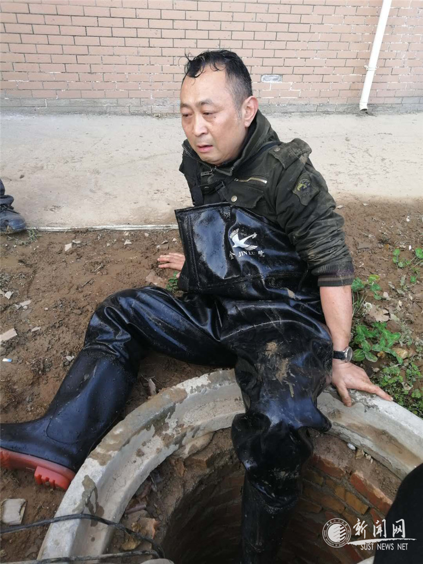 葛磊(中)下到狹小的污水井里進(jìn)行管道疏通