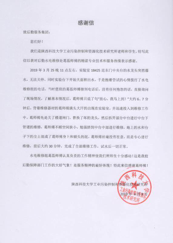 4月9日,學(xué)校工業(yè)污染控制和資源化技術(shù)研究所老師和學(xué)生聯(lián)名給后勤集團(tuán)寫(xiě)去感謝信,感謝后勤水電維修班葛磊師傅搶修及時(shí),修理高效,表示衷心感謝,感謝后勤集團(tuán)為牢記使命服務(wù)師生至上的宗旨。