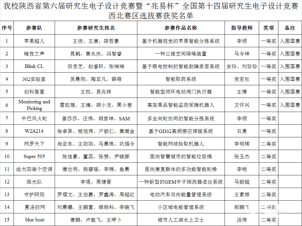 中國(guó)研究生電子設(shè)計(jì)競(jìng)賽是由教育部學(xué)位與研究生教育發(fā)展中心、全國(guó)工程專業(yè)學(xué)位研究生教育指導(dǎo)委員會(huì)、中國(guó)電子學(xué)會(huì)聯(lián)合主辦的研究生學(xué)科競(jìng)賽,是“中國(guó)研究生創(chuàng)新實(shí)踐系列大賽”主題賽事之一。本屆大賽共有來(lái)自西北地區(qū)31所高校的558支隊(duì)伍、2500余名師生參賽,較上屆增長(zhǎng)20%,經(jīng)作品展示、現(xiàn)場(chǎng)問(wèn)辯、作品答辯三個(gè)環(huán)節(jié),最終共有111支隊(duì)伍獲一等獎(jiǎng)、164支隊(duì)伍獲二等獎(jiǎng)、199支隊(duì)伍獲三等獎(jiǎng),58支隊(duì)伍入圍國(guó)賽。