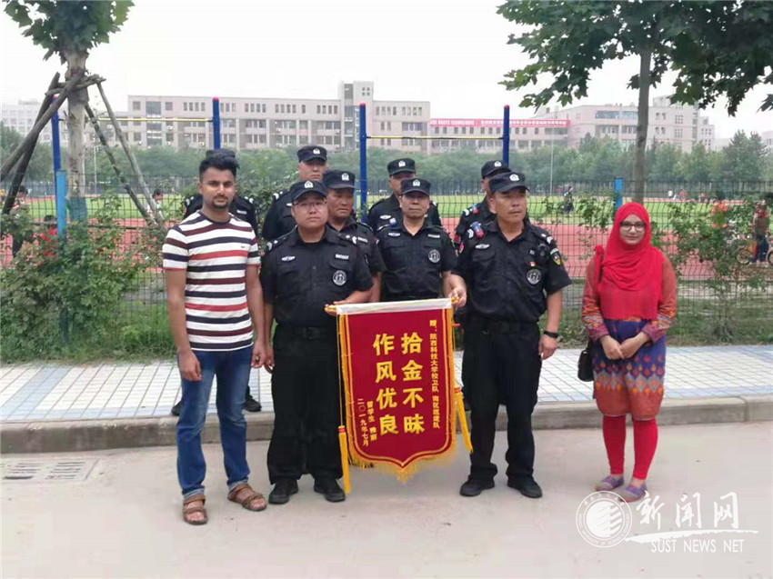 7月11日下午,校衛(wèi)隊交接班時,出現(xiàn)了感人的一幕:兩名留學生將一面上書“拾金不昧,作風優(yōu)良”八個大字的錦旗,親手交到校衛(wèi)隊班長張戰(zhàn)勝手中,并不住地說“謝謝”。張戰(zhàn)勝不好意思地連連擺手,“沒啥,我們經(jīng)常這樣做”。