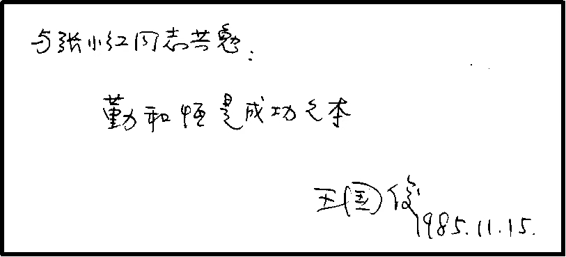 和年輕學(xué)子一樣,我年輕時也會追星,我崇拜的明星很少,不過卻堅(jiān)持了幾十年。這里,也分享給大家一位我崇拜的明星。讀大學(xué)時,我校多次邀請當(dāng)時擔(dān)任陜西師范大學(xué)校長的王國俊教授來作學(xué)術(shù)報(bào)告,他曾經(jīng)在我的家鄉(xiāng)做過中學(xué)老師,不僅數(shù)學(xué)研究很深入、成果豐富,課也講得很漂亮,我被他的魅力深深吸引,聽他講數(shù)學(xué)就是一種享受。畢業(yè)留校那年,我校再次邀請王國俊教授來作報(bào)告,我很榮幸參與接待他。在學(xué)術(shù)交流間隙,我?guī)е鴦偰玫讲痪玫氖讉€教師節(jié)紀(jì)念冊,找他簽名,并希望他給予指點(diǎn)。王老師把他的座右銘寫了下來贈予我,這也成為我日后幾十年激勵自己不懈努力的座右銘。