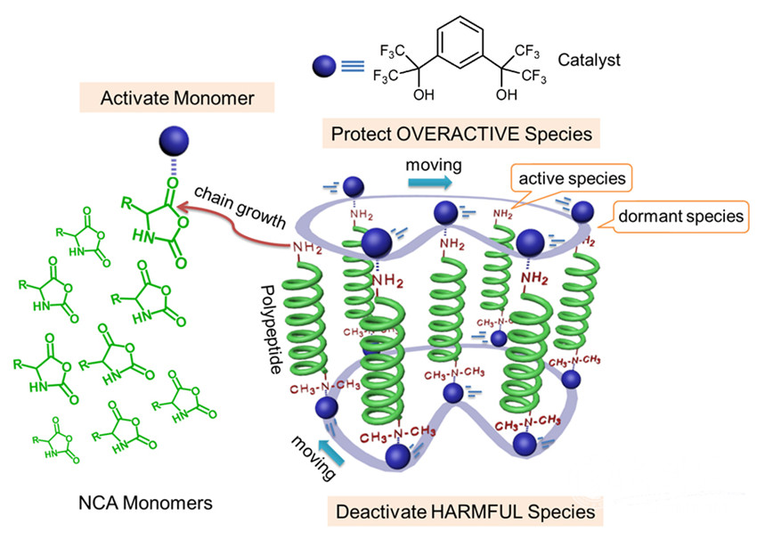 該研究主要受自然界廣泛存在的“多重協(xié)同氫鍵”作用啟發(fā),成功開發(fā)出一類基于有機氟醇小分子的高活性和高選擇性催化體系,并將該體系應(yīng)用于聚肽類生物材料的高效精密合成,實現(xiàn)了從天然氨基酸出發(fā)借助綠色催化高效合成清潔聚肽材料的路線突破。該項研究工作不僅首次揭示了氟醇分子的一種新催化機理,而且為聚肽材料的合成提供了一種高效、精確和綠色的普適性方法。所開發(fā)的氟醇催化體系是目前聚肽材料合成最為高效的體系且商業(yè)易得,目前已申請兩項國家發(fā)明專利。