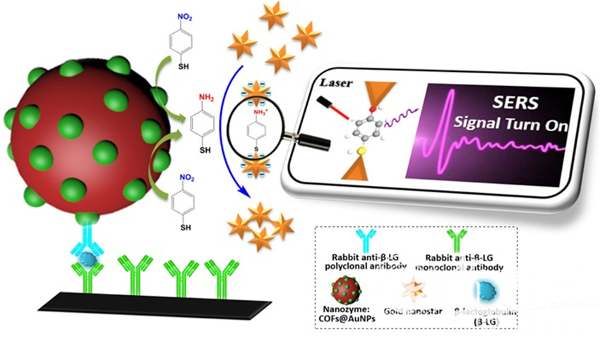 以“Ratiometric Surface Enhanced Raman Scattering Immunosorbent Assay of Allergenic Proteins via Covalent Organic Framework Composite Material Based Nanozyme Tag Triggered Raman Signal “Turn-on” and Amplification”為題的論文發(fā)表在分析化學(xué)領(lǐng)域著名期刊《Analytical chemistry》(IF 6.350,自然指數(shù)期刊),該研究中建立了基于納米酶作為ELISA催化標(biāo)簽的乳制品中過敏蛋白的拉曼檢測技術(shù),實(shí)現(xiàn)了β乳球蛋白穩(wěn)定、高靈敏檢測。