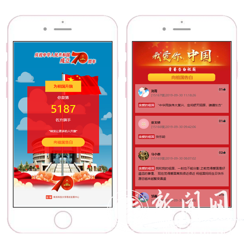 校易班發(fā)展中心最先在網(wǎng)上發(fā)起“我為祖國升國旗”H5頁面,活動一經(jīng)發(fā)起就得到廣大青年學生的積極響應,活動上線僅1小時,學生通過易班、微信、QQ等平臺完成的轉(zhuǎn)發(fā)就達到1000余條,截止目前參加活動的人數(shù)已超過6000人。同時,校易班中心在易班網(wǎng)搭建“青春告白祖國”的輕應用,累計瀏覽量已超過10萬次,通過網(wǎng)絡發(fā)布的“告白”超過16000余條。