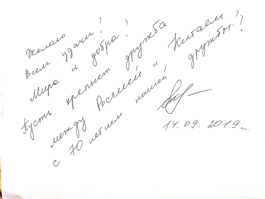 9月14日,代表團(tuán)出席2019年中俄建交70周年之際的莫斯科“中國節(jié)”開園儀式,陜西省委副書記賀榮、省委教育工委書記董小龍等領(lǐng)導(dǎo)參觀我校宣傳展位,俄羅斯聯(lián)邦國家杜馬教育委員會(huì)副主席圖托娃·拉麗莎·尼古拉耶夫娜女士親臨我校展位并題字----祝賀中俄建交70周年!祝愿世界和平充滿愛!祝愿中俄友誼長存!祝福大家好運(yùn)!