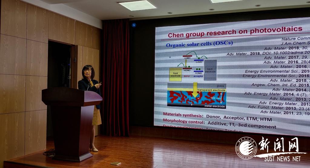 陳紅征教授報(bào)告的題目是“高效低成本有機(jī)太陽(yáng)電池材料與器件”,她闡述了發(fā)展有機(jī)太陽(yáng)能電池的重要意義,指出影響太陽(yáng)能電池轉(zhuǎn)化效率的因素。主要針對(duì)傳統(tǒng)的通過(guò)稠合方式合成有機(jī)太陽(yáng)電池材料存在合成工藝復(fù)雜、成本高的問(wèn)題,提出非稠合法合成有機(jī)太陽(yáng)能電池材料的新方法,此方法具有合成過(guò)程簡(jiǎn)單,高效率、低成本的優(yōu)點(diǎn)。而且,非稠合分子基于碳-氫-氧弱相互作用的構(gòu)象為優(yōu)勢(shì)構(gòu)象,分子骨架在溶液中易扭轉(zhuǎn),具有良好的溶液加工性和優(yōu)異的薄膜光電特性,在有機(jī)太陽(yáng)能電池材料與器件的制備過(guò)程中具有很高的應(yīng)用價(jià)值。陳教授還就師生們有關(guān)鈣鈦礦太陽(yáng)能電池、導(dǎo)電高分子材料等存在的問(wèn)題進(jìn)行了細(xì)致解答。