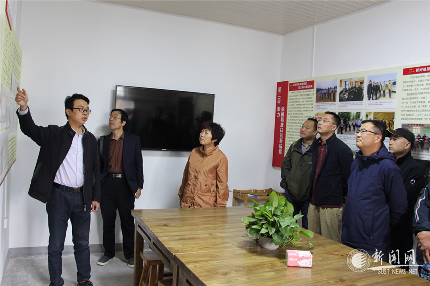 姜興健給來村學習教育的陜科大教師講解《陜西科技大學扶貧工作展》