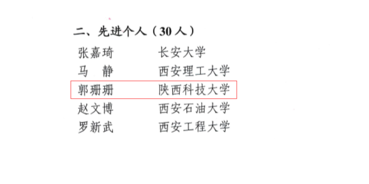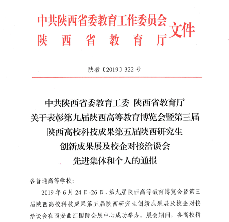 省委教育工委、省教育廳近日發(fā)布《關(guān)于表彰第九屆陜西高等教育博覽會暨第三屆陜西高校科技成果第五屆陜西研究生創(chuàng)新成果展及校企對接洽談會先進集體和個人的通報》陜教〔2019〕322號文件,表彰全省高校在參展工作中表現(xiàn)突出的單位及個人,我校宣傳部郭姍姍同志獲“先進個人”稱號。