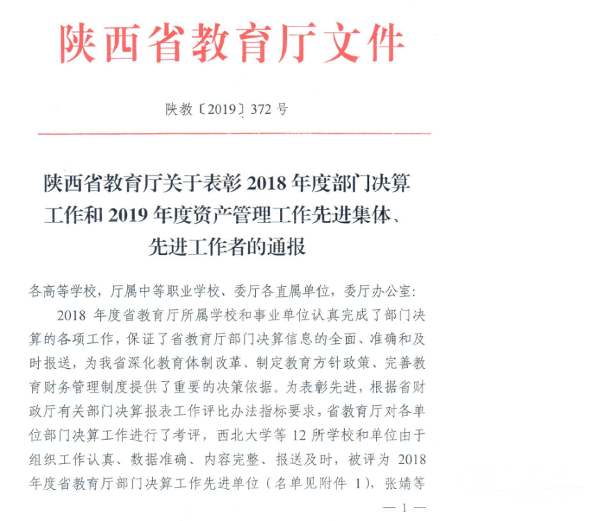 12月23日,陜西省教育廳下發(fā)《關(guān)于表彰2018年度部門決算工作和2019年度資產(chǎn)管理工作先進(jìn)集體、先進(jìn)工作者的通報(bào)》(陜教[2019]372號)文件,我校榮獲2019年度教育行政事業(yè)單位國有資產(chǎn)管理先進(jìn)集體。這是我校連續(xù)6年獲此榮譽(yù)。