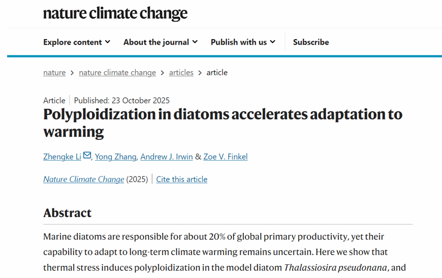 近日,我校食品科學(xué)與工程學(xué)院(生物與醫(yī)藥學(xué)院)李政科副教授與福建師范大學(xué)的張勇副教授、加拿大達(dá)爾豪斯大學(xué)的Zoe V. Finkel教授和Andrew J. Irwin教授合作,在國際頂級期刊《自然·氣候變化》(Nature Climate Change)發(fā)表了題為“硅藻多倍體化加速其對氣候變暖的適應(yīng)”的研究論文。我校李政科副教授為第一作者和通訊作者,陜西科技大學(xué)為第一單位。該研究成果得到了國家自然科學(xué)基金面上項目和青年基金(32371681,32001180)、加拿大自然科學(xué)暨工程研究委員會基金、加拿大研究主席項目、美國CBIOMES等項目的資助。該研究證實,熱脅迫具有誘導(dǎo)海洋硅藻假微型海鏈藻(Thalassiosira pseudonana)發(fā)生多倍體化(即基因組加倍)的潛力,且多倍體藻株在高溫環(huán)境下表現(xiàn)出比二倍體祖先更快的適應(yīng)速度。