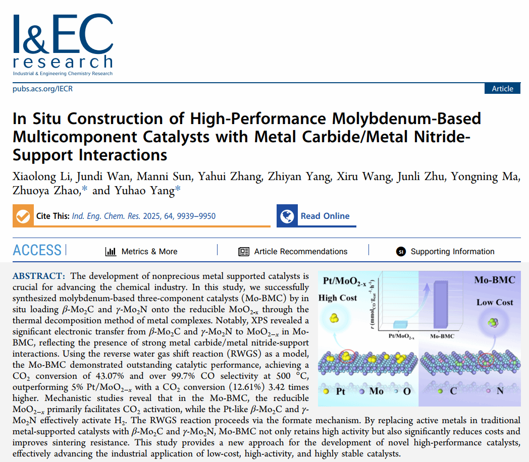 團(tuán)隊(duì)采用金屬絡(luò)合物原位熱分解法,在可還原載體MoO???上原位生成β-Mo?C與γ-Mo?N,成功構(gòu)建出具有類貴金屬特性的鉬基三組分催化劑—Mo-BMC。以逆水煤氣變換反應(yīng)(RWGS)為模型反應(yīng),Mo-BMC在500 °C下實(shí)現(xiàn)CO?轉(zhuǎn)化率43.07%、CO選擇性超99.7%,性能為同條件下5%Pt/MoO???的3.42倍。機(jī)理研究標(biāo)明MoO???是CO?的活性中心,而β-Mo?C和γ-Mo?N是H?的活性中心,反應(yīng)經(jīng)甲酸鹽路徑進(jìn)行。該策略以非貴金屬替代傳統(tǒng)金屬活性中心,展示了以類貴金屬化合物替代傳統(tǒng)貴金屬的有效途徑,在保證催化性能的同時(shí)降低催化劑成本、提高抗燒結(jié)穩(wěn)定性方面具有顯著優(yōu)勢(shì)。研究成果以題為 “In Situ Construction of High-Performance Molybdenum-Based Multicomponent Catalysts with Metal Carbide/Metal Nitride-Support Interactions” 發(fā)表在《Industrial & Engineering Chemistry Research》。該工作主要由2022級(jí)碩士研究生萬(wàn)俊弟完成。https://doi.org/10.1021/acs.iecr.5c00319