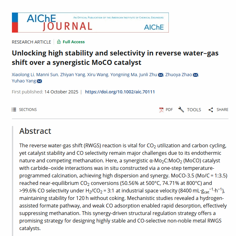團(tuán)隊(duì)通過(guò)一步控溫焙燒法原位構(gòu)建碳化物–氧化物協(xié)同體系(α-Mo?C:MoO?),形成高分散MoCO復(fù)合界面。MoCO-3.5在CO?/H? = 1:3條件下,于800 °C實(shí)現(xiàn)74.71% CO?轉(zhuǎn)化率和超過(guò)99.6%的CO選擇性,在工業(yè)級(jí)反應(yīng)空速下具有優(yōu)異穩(wěn)定性且無(wú)積碳生成。機(jī)理研究表明該催化劑遵循氫輔助的甲酸鹽反應(yīng)機(jī)理。CO的快速脫附有效抑制了CO在催化劑表面被深度加氫生成甲烷。該成果為開發(fā)高穩(wěn)定、高選擇性、非貴金屬催化劑提供了新思路。研究以“Unlocking high stability and selectivity in reverse water-gas shift over a synergistic MoCO catalyst”為題發(fā)表在《AIChE Journal》。實(shí)驗(yàn)工作主要由2023級(jí)碩士研究生孫曼妮完成。https://doi.org/10.1002/aic.70111